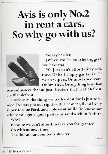 Nos anos 60 e no auge da filosofia do businessman americano de sucesso a todo custo, uma empresa de aluguel de carros ia mal. A Avis era 2ª no mercado, com participação de 11% e caindo. Bill Bernbach, o publicitário responsável pela conta da empresa (e um dos maiores da história), teve a sacada: assumir o fracasso. A partir daí, a Avis se colocou no seu lugar. Dizia que o segundo lugar não podia se dar ao luxo de cometer erros. Além disso, suas lojas tinham menos filas.