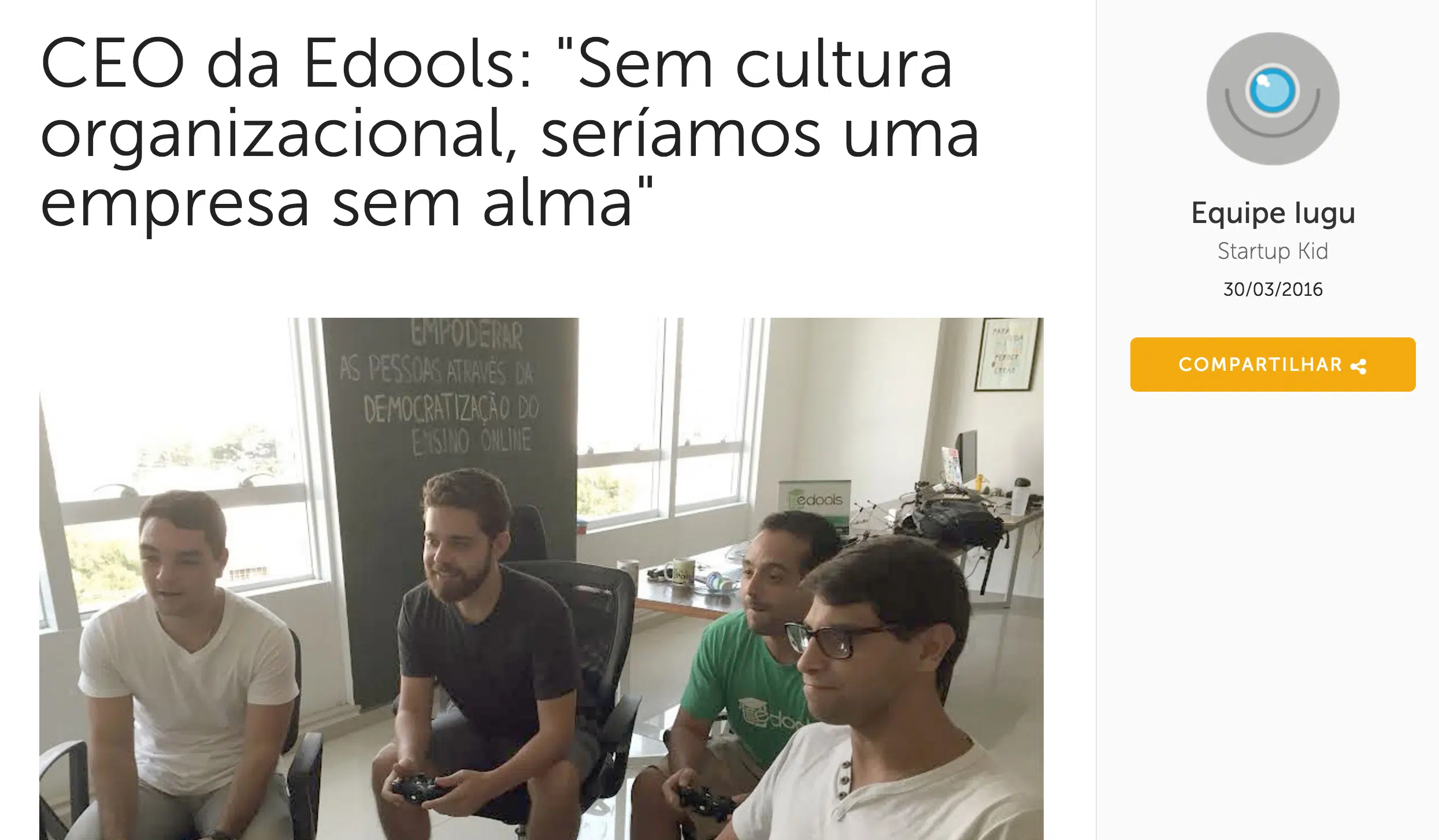 Blog da startup Iugu publicou post com entrevista de Rafael Carvalho falando sobre a cultura organizacional da Edools. “Sem cultura organizacional, serรญamos uma empresa sem alma” foi a frase de destaque da entrevista.